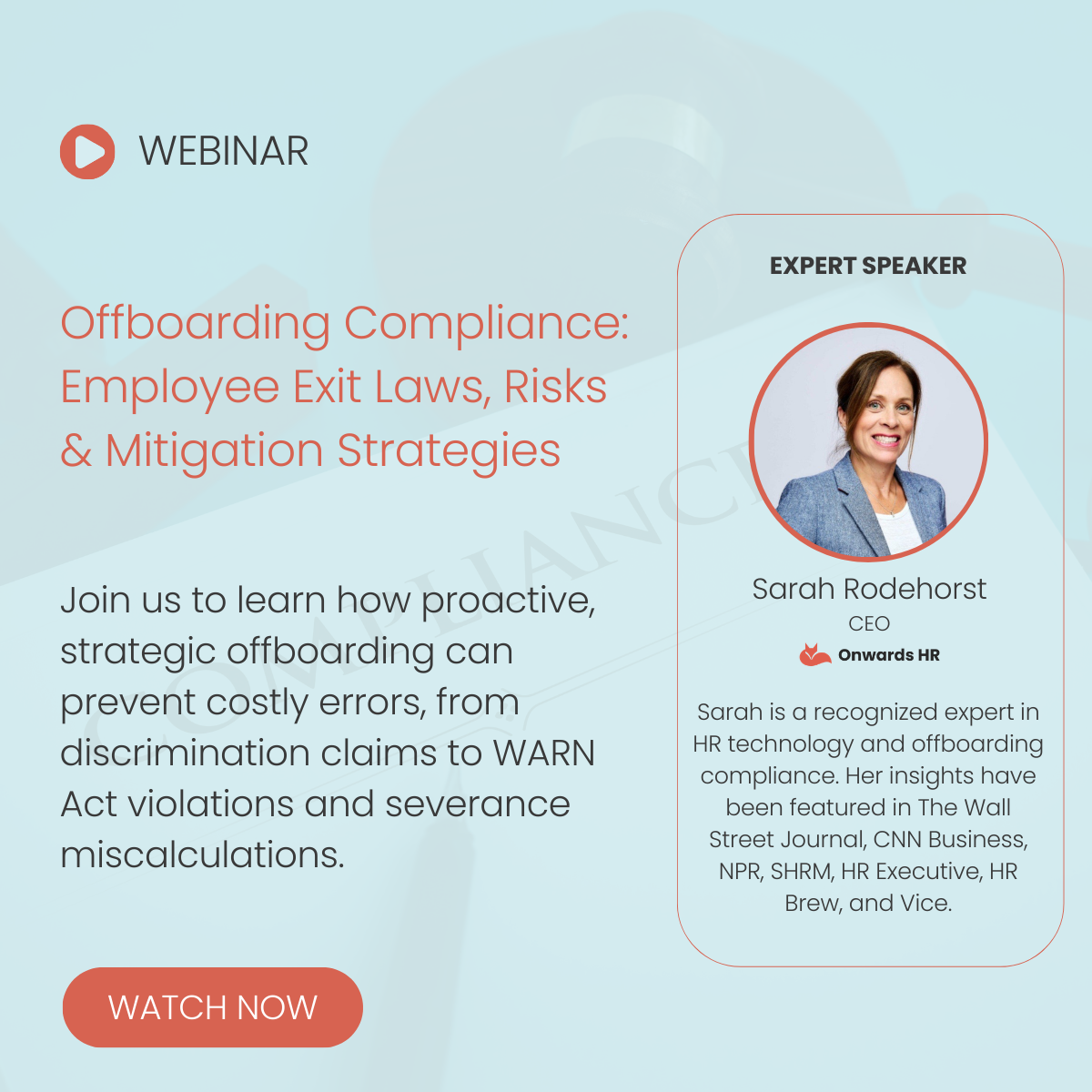 Sarah Rodehorst is the Chief Executive Officer of Onwards HR, the preferred offboarding compliance platform for people-first Fortune 500 companies. Onwards HR helps companies manage workforce reductions, severance pay and packages, and compliance with efficiency and compassion. A recognized expert in HR technology, compassionate layoffs, and offboarding compliance, Sarah’s insights have been featured in The Wall Street Journal, CNN Business, NPR, SHRM, HR Executive, HR Brew, and Vice. She is passionate about helping organizations navigate employee separations with fairness and transparency.